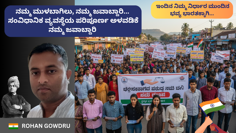 ರಾಷ್ಟ್ರೀಯ ಸಾಮಾಜಿಕ ಹೋರಾಟಗಾರ ರೋಹನ್ ಗೌಡ ಅವರು ಮುಳಬಾಗಿಲು ಜನತೆಗೆ ನೀಡಿದ ಎಚ್ಚರಿಕೆಯ ಕರೆ. ಭ್ರಷ್ಟ ವ್ಯವಸ್ಥೆಯನ್ನು ತಿರಸ್ಕರಿಸಿ, ಸಂವಿಧಾನದ ಆಶಯಗಳನ್ನು ಎತ್ತಿಹಿಡಿದು, ಯುವಶಕ್ತಿಯು ಸಮಾಜದ ಬದಲಾವಣೆಗಾಗಿ ಒಂದಾಗಬೇಕೆಂದು ಅವರು ಆಗ್ರಹಿಸಿದ್ದಾರೆ.